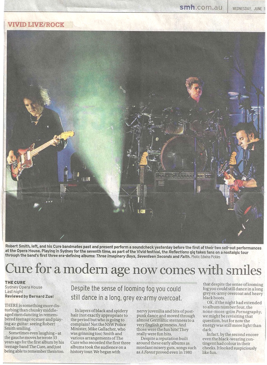 The Cure to perform for Vivid LIVE at Sydney Opera House. Appearing onstage with a uniquely evolving line-up of band members past and present, The Cure "Reflections" will see the band perform their first three albums live, in their entirety, in an extraordinary concert experience exclusively for Vivid LIVE on May 31 and June 1.